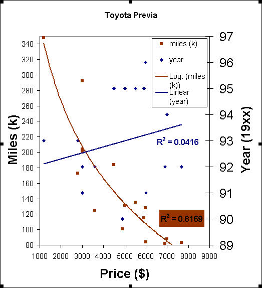 | RESULTS: THE PRICE OF THE VEHICLE IS MUCH MORE DEPENDANT ON THE MILEAGE THAN THE YEAR. The R^2 value indicates the fit of the line to the points.1 is the best, 0 the worst. The year can be seen to have no measurable relationship, the mileage is a good correlation. The variance from the trend line probably reflects the condition of the van. |